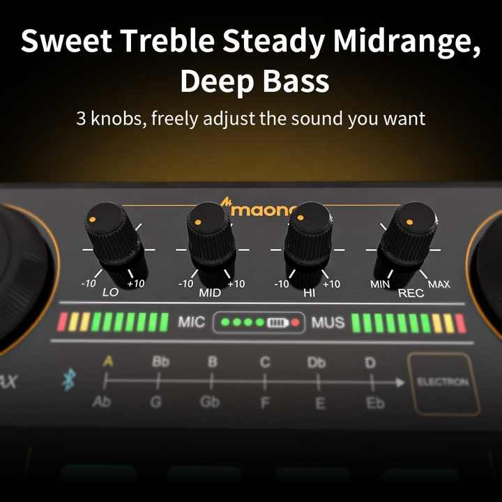 MAONOCASTER AM200 audio mixer support two 3.5mm microphones input, 1 headphone jack for monitoring, 1 jack for speaker, 1jack for music input, 3 audio jacks for output, USB to C for battery charge.