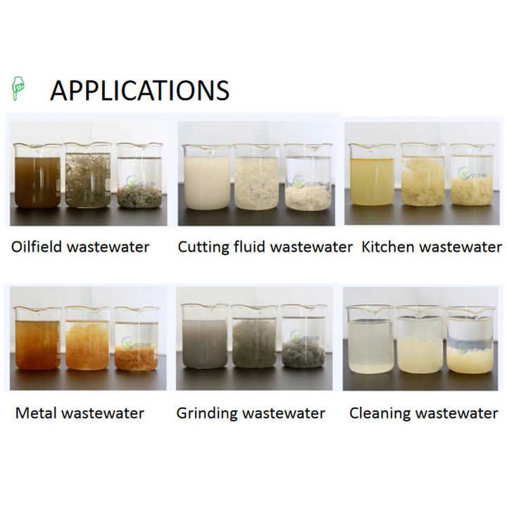Recommendations: Select demulsifier and determine dosage by small batch test in laboratory 1.Take 100ml of raw waste water, add the corresponding amount of demulsifier and stir it for 10S. 2. Add PH valueregulator to make raw water PH value to be 7-9, and continue to stir for 10S. 3.Add the coagulant (polyacrylamide) aqueous solution to accelerate flocculation,stir it for 15S, and wait for the precipitation to finish; 4. Increase or decrease demusification dosage according to the demulsification effect of raw wate to determine finial minimum dosage.